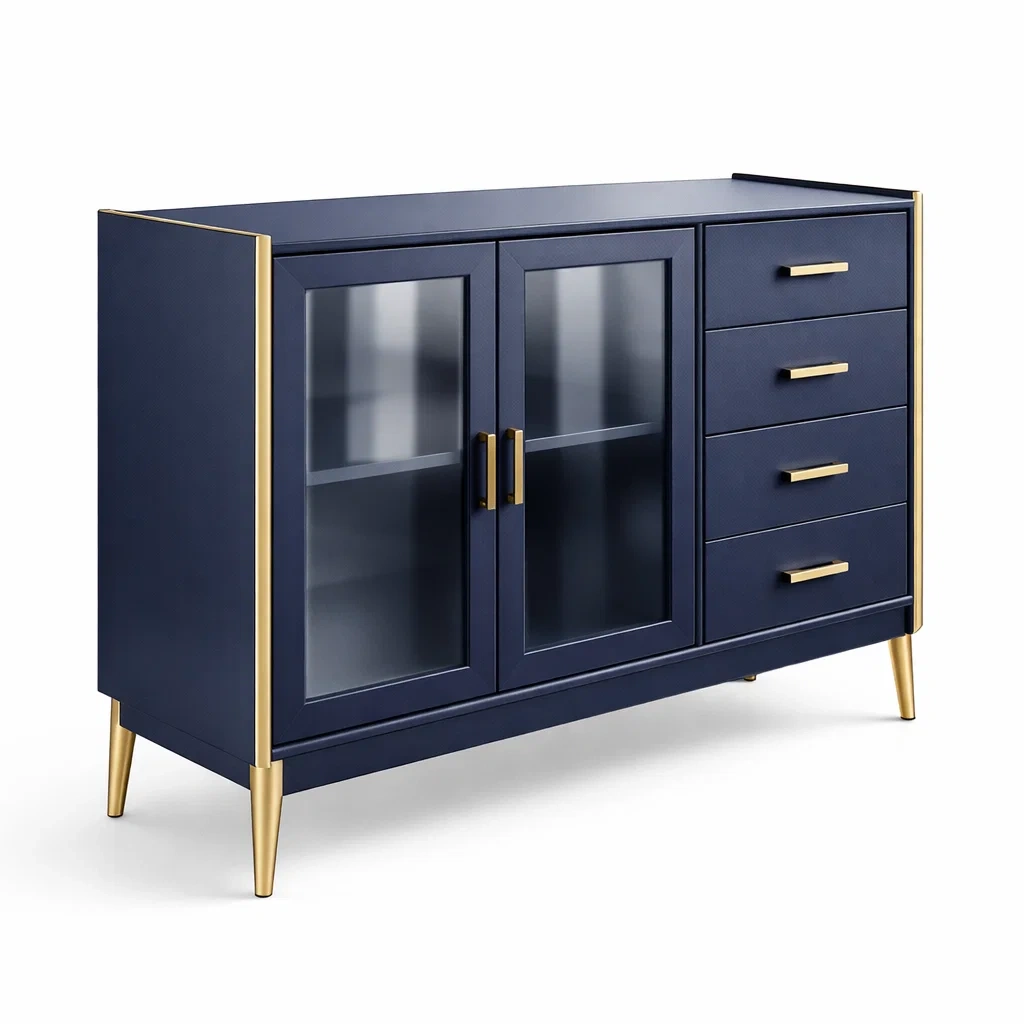 Buffet en MDF avec portes en verre trempé et tiroirs dorés