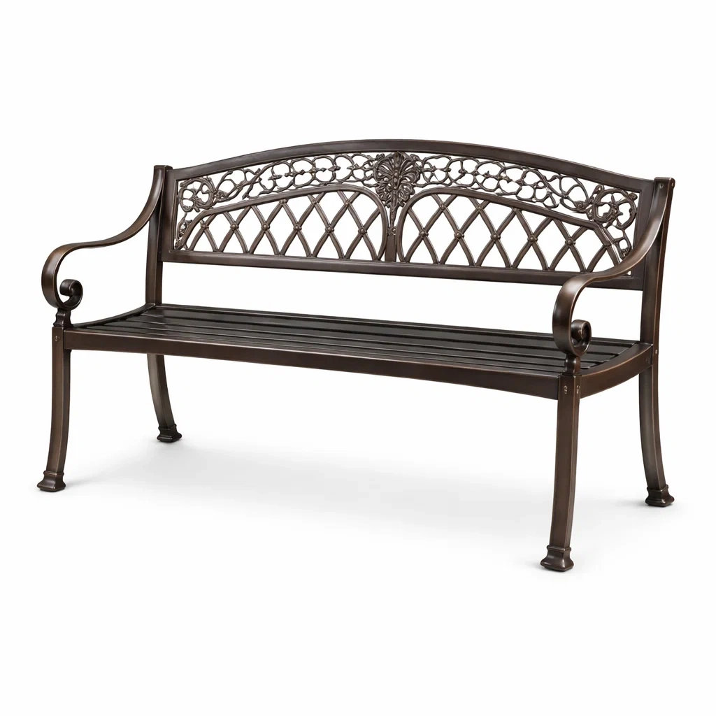 Le banc est de couleur marron et présente un dossier avec des motifs décoratifs. Il est recouvert d'une peinture résistante aux intempéries.